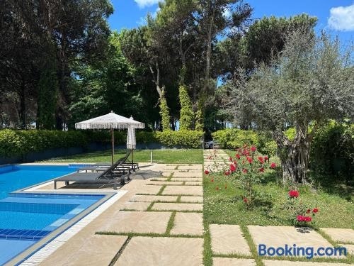 Apresentando uma piscina exterior sazonal, um jardim e um salão partilhado, Beachfront Villa with Private Pool by Monika Experiences dispõe de acomodações em Golem com acesso Wi-Fi gratuito e vista do rio.