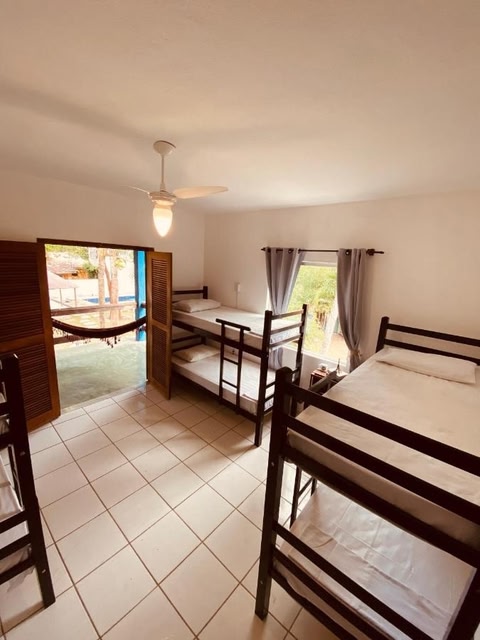 Comfortable Accommodations: Adios Amigos Hostel in Arraial d'Ajuda offers family rooms with shared bathrooms, balconies, and garden views. Each room includes a wardrobe, TV, and minibar.