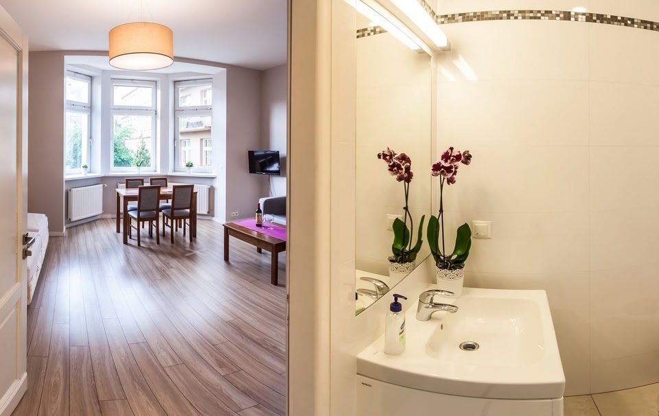 In Kraków (Kraków City Centre). With a stay at Emaus Apartments in Kraków (Kraków City Centre), you'll be within a 5-minute drive of Main Market Square and Wawel Castle. This aparthotel is 1.3 mi (2.1 km) from Royal Road and 3.5 mi (5.7 km) from Oskar Schindler Factory. Make yourself at home in one of the 17 guestrooms, featuring kitchenettes with full-sized refrigerators/freezers and stovetops. Your bed comes with premium bedding, and all rooms are furnished with double sofa beds. Complimentary wireless internet access keeps you connected, and LCD televisions are provided for your entertainment. Conveniences include microwaves and a turndown service, and housekeeping is provided daily. Take advantage of the aparthotel's room service (during limited hours). Continental breakfasts are available daily from 7:00 AM to 11:00 AM for a fee. Pamper yourself with onsite massages or take in the view from a garden. Additional amenities at this aparthotel include complimentary wireless internet access and tour/ticket assistance.