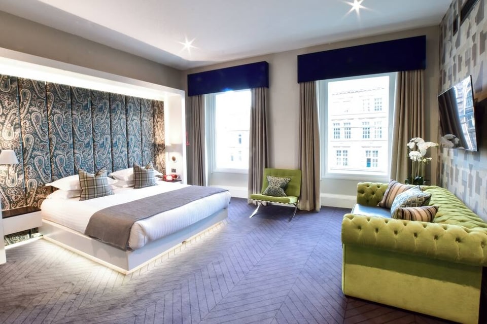 O glamoroso Rutland Hotel exibe quartos elegantes, um salão luxuoso e um restaurante exclusivo com uma adega em vidro. Além disso, a propriedade situa-se na área oeste da Princes Street (rua) e proporciona vistas para o Castelo de Edimburgo.